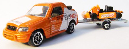 Toyota Rav4 in orange with trailer and go cart. 1:50 scale made in 2013, mint